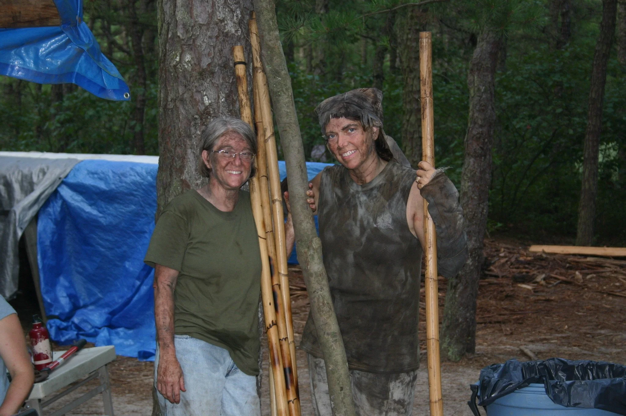 One of my team members and me with lances and one person’s “log”. My face is way too clean!