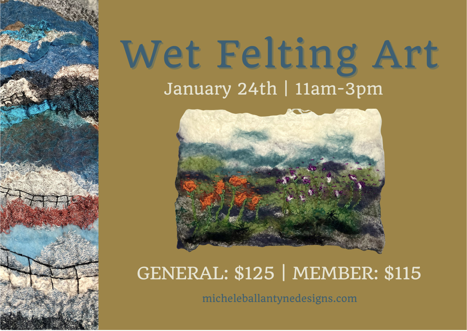 Michele Ballantyne is coming back to teach you wet felting techniques and guide you through creating your very own work of felt art! Wet felting can be done by anyone and is a fun, creative, interactive way to recreate the world around you in an abstract way. The design can be up to 320 square inches, whether that be in a square, rectangle, or multiple smaller designs. Makes a great gift, or activity! Michele will supply the tools and all the wool for felting in a large of assortment of colors, as well as silk gauze, other decorative fibers, and yarns that can be added then, or later on! You choose your colors and design! Come create beautiful felted wall art for your home!